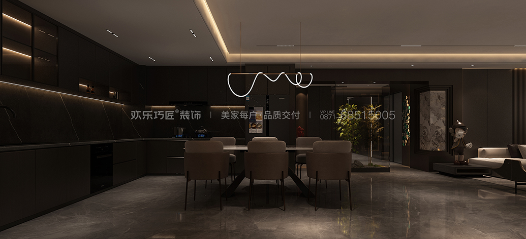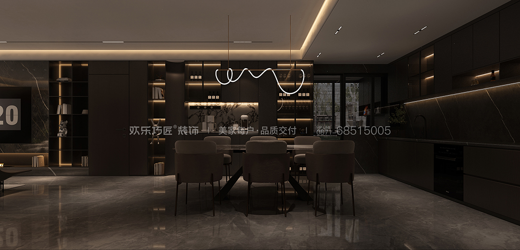 奢华底色之上具备生活的温暖触感,深色沙发背景墙与泛着暖金色光泽的大理石相逢,孕育沉稳华贵气息,宽奢的空间尺度抒写多元生活故事。