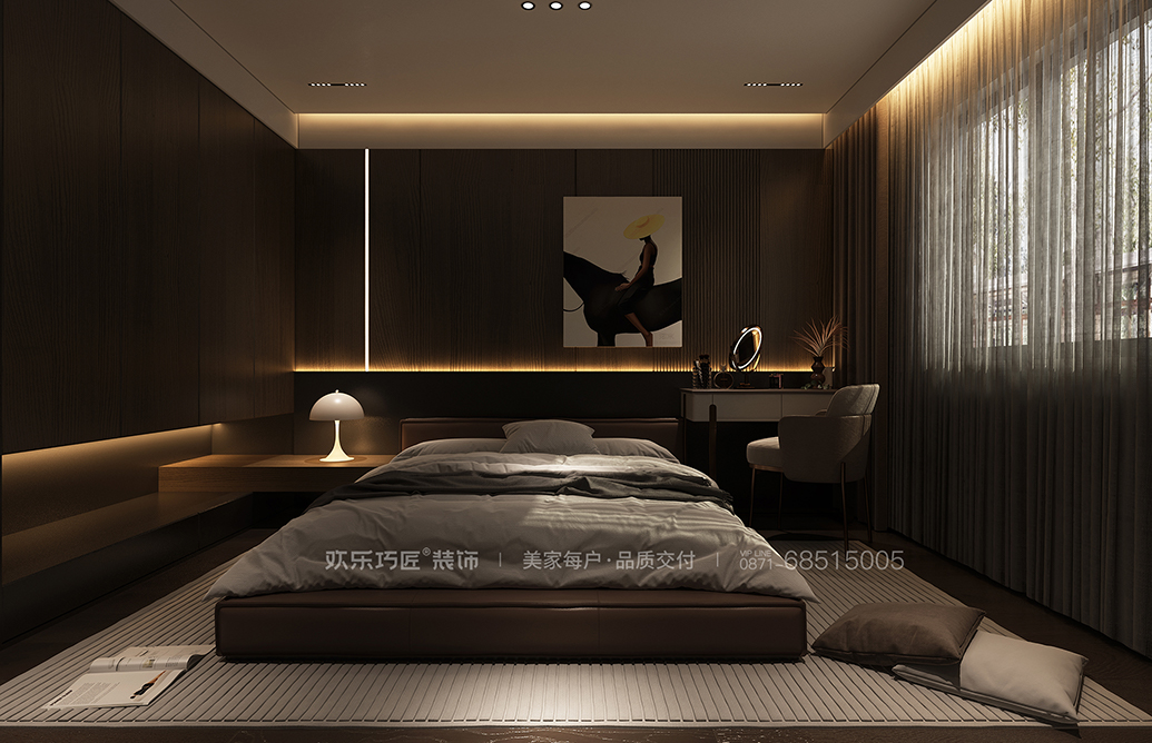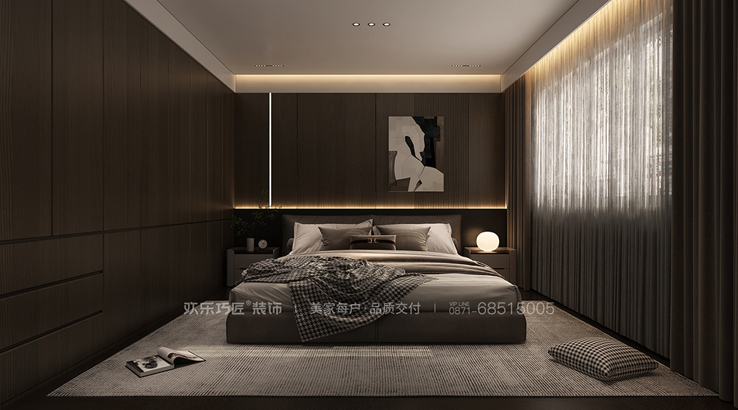 床头背景墙采用木饰面,流畅简洁的线条塑造沉稳、质朴格调,搭配柔和的光线,光影变成剪影,与生活同频。