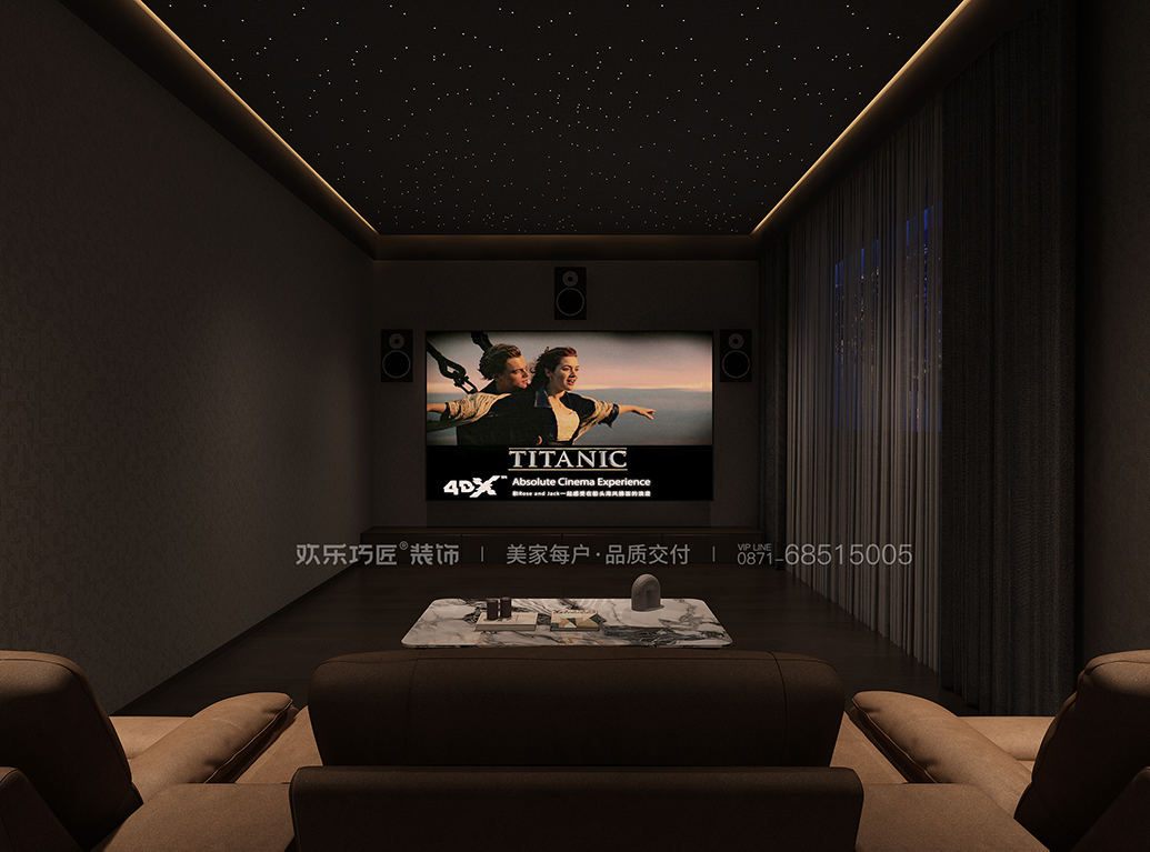 影音室以大面积的留白、无主灯的设计使得空间轻盈通透,增强视觉焦点。再搭配按摩椅、大屏幕、星空顶,在氛围感爆棚的空间来一场视听盛宴。